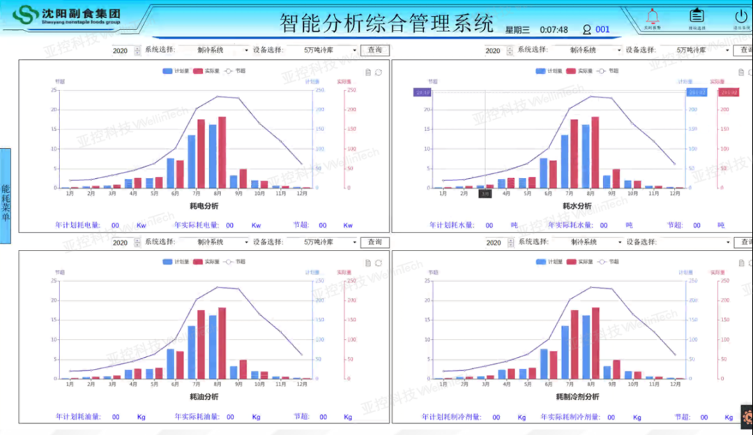 平台实现了远程自动化控制系统运行参数曲线,报警信息自动采集并储存,通过计算吨日能耗,同期对比分析,从而提供节能高效及综合分析管理方案。