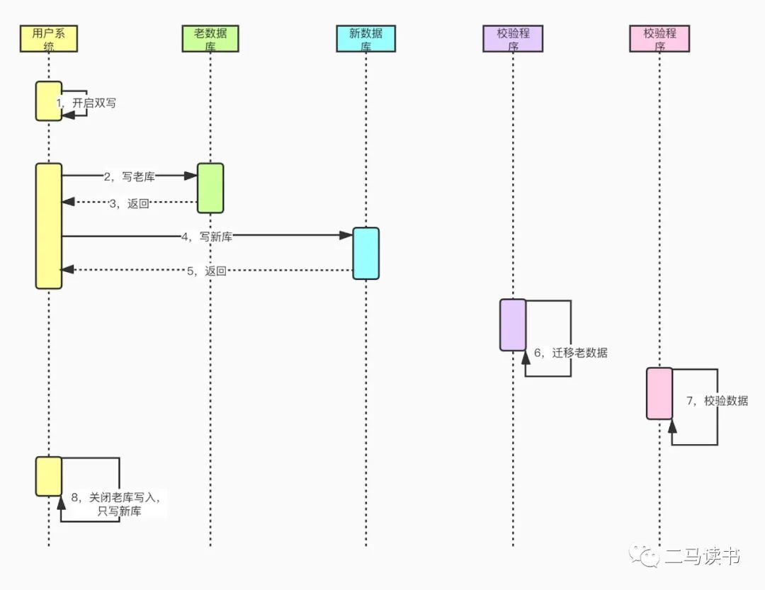 老库和新库同时写入,然后将老数据批量迁移到新库,最后流量切换到新库并关闭老库读写。