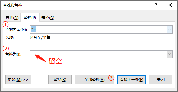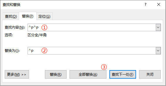 (2) “查找内容”中,输入两个“^p”(代表段落标记,也就是回车符),或者单击“更多”→“特殊格式”→“段落标记”。