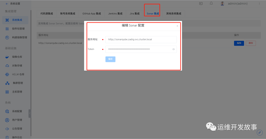 在Sonar集成栏目填写具体的sonar地址和刚才生成的Token,保存即可。