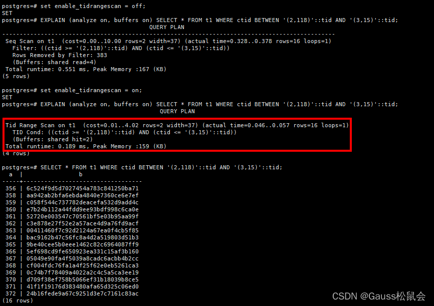 tidrangescan插件定义了一个bool类型的guc参数:enable_tidrangescan,控制优化器对tidrangescan扫描算子的使用,on表示使用,off表示不使用。
