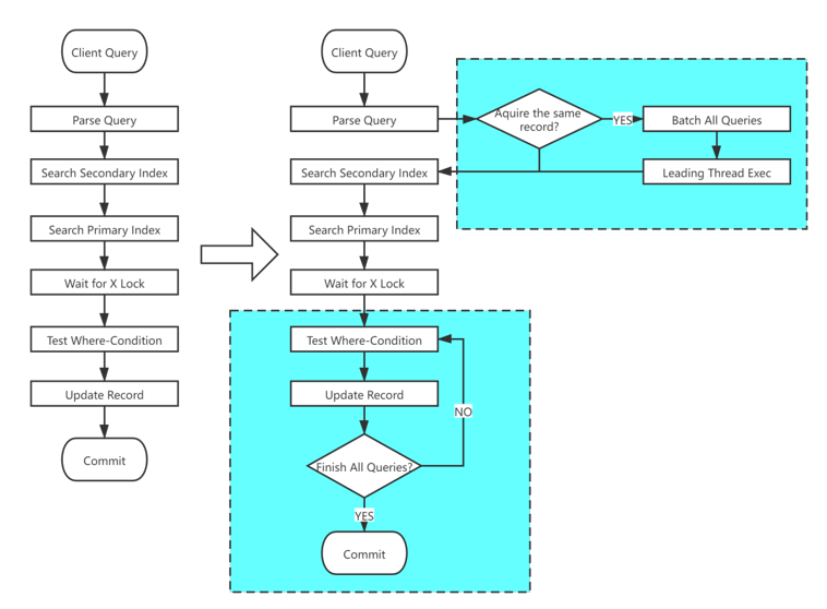 SQL 语句更新列热点标识:对于带有热点更新标识的 SQL ,团队会在数据库内部维护一个哈希表,会将相同数据的 SQL 放在哈希表的一个队列里; 批量处理:经过一段时间之后,团队会针对队列里的 SQL 进行合并处理; 语法糖:为了更好地满足业务需求,veDB支持打开 Binlog ,以及语法糖,比如:Auto_Logic_Commit_Rollback hint,是指成功就自动提交,否则 Rollback;另外veDB扩展 Update..returning,支持语句返回。