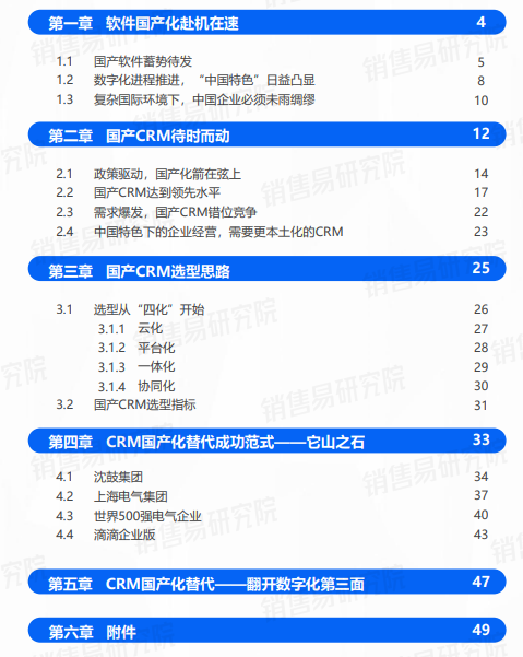 除此之外,在《CRM国产化替代选型指南》中,销售易研究院还挑选沈鼓集团、上海电气、滴滴等500强企业的实操案例,希望通过其成功的数字化转型实践、国产CRM替代的宝贵经验,为更多企业带来参考。
