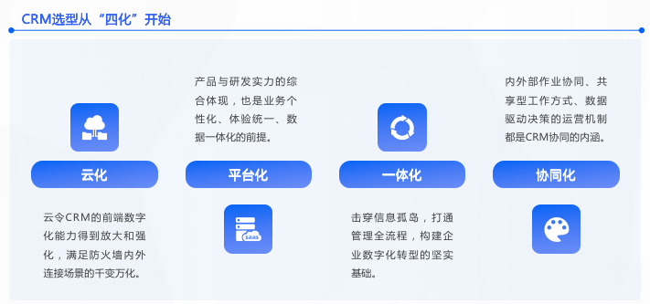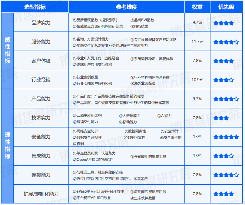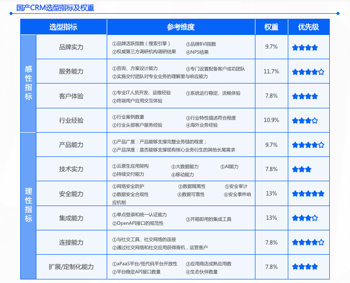 区别于信息化时代企业构建IT系统的选型特征,云服务的CRM因更强的灵活性、高可用、可适应、快速部署、在线可视化等特性,具备了除功能参数以外更多的量化参考指标,企业可以从“感性”和“理性”两大维度去综合选择适合企业自身业务特性和发展的国产CRM品牌,才能实现CRM为企业可持续增长带来最大的赋能和助力。