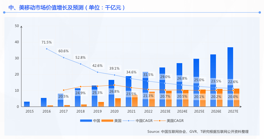 截止2020年,工信部数据显示中国移动网络普及率为108%,同期全球互联网普及率为65%(IWS)。与固网宽带相比,中国区域的移动化程度显著高于全球平均水平,移动网络的基础以及与之相关的移动产业链上下游综合发展呈现出更强的竞争力。依托移动网络为基础的商业生态也呈现更强的增长活力,中国移动数据流量的人均消费水平已超过世界平均水平,并且仍有很大的发展空间。自2015年中国移动化市场全面进入高速增长期以来,一直保持超过30%的CAGR,并在未来五年发展中预计依旧达到20%以上的增速。而在欧美地区,同期移动互联网所产生的价值要远低于中国区域,在增速方面也相对滞后。