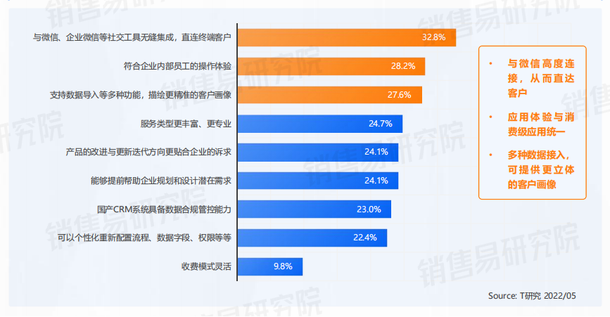 区别于信息化时代企业构建IT系统的选型特征,SaaS CRM因更强的灵活性、高可用、可适应、快速部署、在线可视化等特性,具备了除功能参数以外更多的量化参考指标。同时,能够直接触达终端客户的特征,也赋予CRM更多的人文关怀属性。