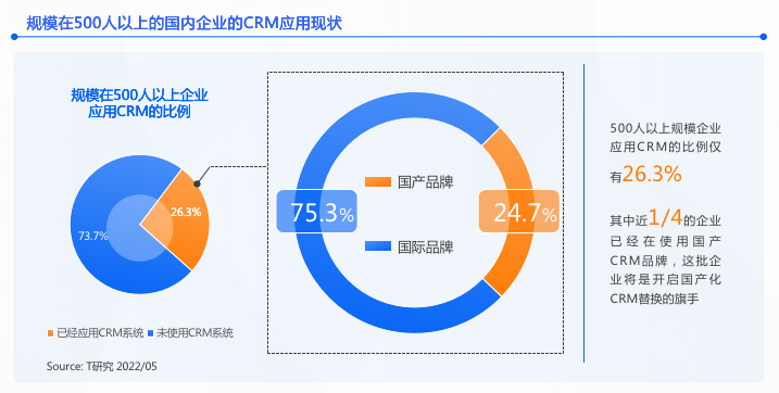 与此同时,面对层出不穷的数据泄露事件和频发的国际政治冲突事件,我国也在相继出台一系列鼓励国产化和数据安全的政策、法律法规,三令五申强调国产化、自主可控的重要意义。作为沉淀了大量个人、企业信息数据的CRM系统,更需要企业在选型时无论是从政策驱动还是企业意识角度,更聚焦国产品牌,避免因数据安全或“断供”、“卡脖子”等问题带来的尴尬……而数据显示,国产CRM品牌也确实已经成为企业选型时的目标方向。