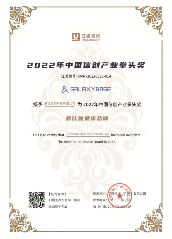 5月26日,iiMedia Research(艾媒咨询)主办“艾媒新经济大讲堂(第3期)暨2022年中国信创产业拳头奖颁奖典礼”。活动以”线上+线下“双渠道展开,以“数据赋能,发掘信创新风口”为主题,聚焦信创产业落地现状,驱动万亿产业发展。典礼上,浙江创邻科技有限公司(以下简称:创邻科技)核心产品Galaxybase国产高性能图数据库凭借行业领先的技术优势和优质的综合实力,获得“最佳数据库品牌”大奖。