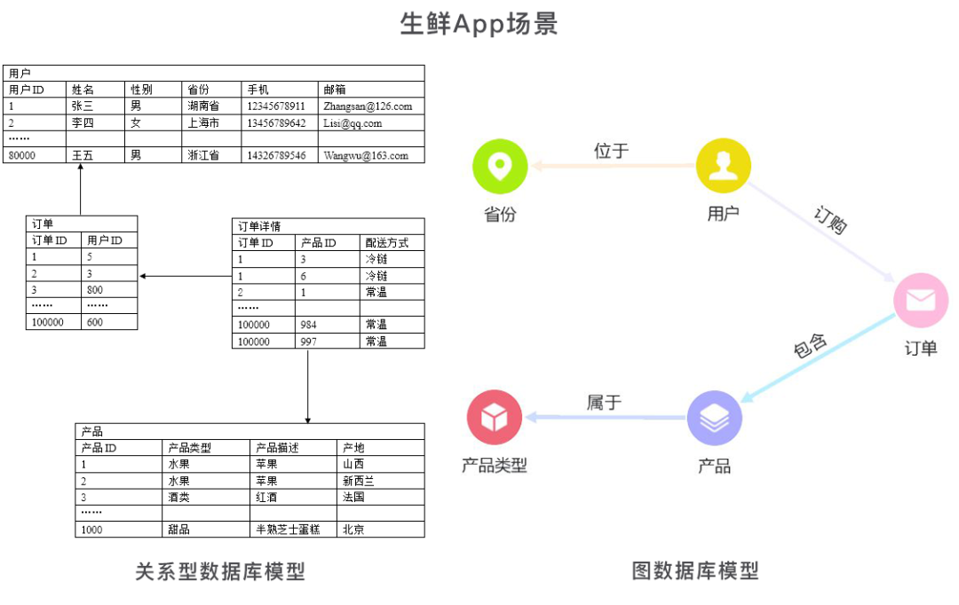图数据库模型中,省份、用户、订单等以节点存储,并通过位于、订购、包含等关系连接。做关联查询时,图数据库只需查询指定实体,比如某一省份,就能实现关联查询,了解该省用户、订单等,查询成本与全局数据量无关。
