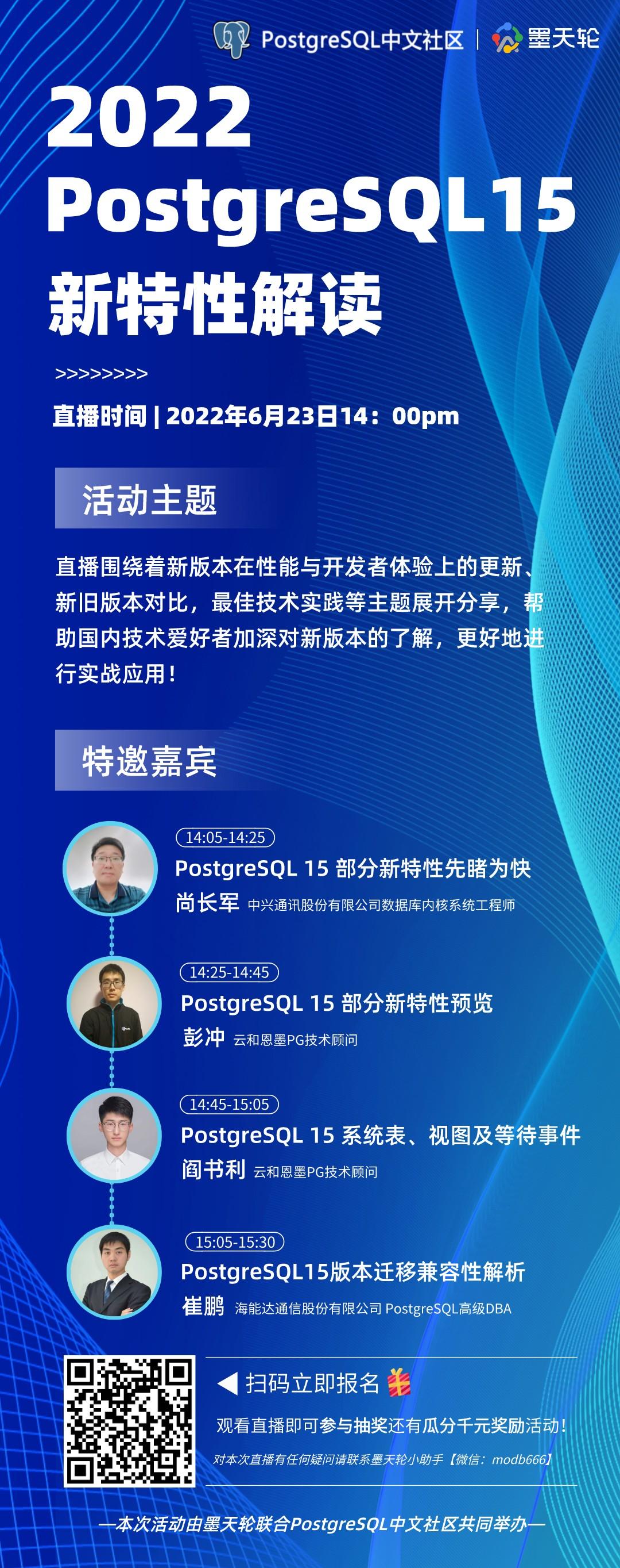 作为国内专业的数据库社区,墨天轮联合PostgreSQL中文社区共同举办《 PostgreSQL 15 新特性解读》直播活动,国内领先的四位PG技术专家将带来专业解读。