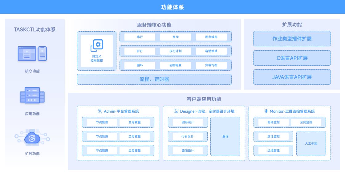 核心功能:包括串行、互斥、并行、断点续跑、执行计划、容错策略、循环、自定义控制策略、关系策略、远程调度等;