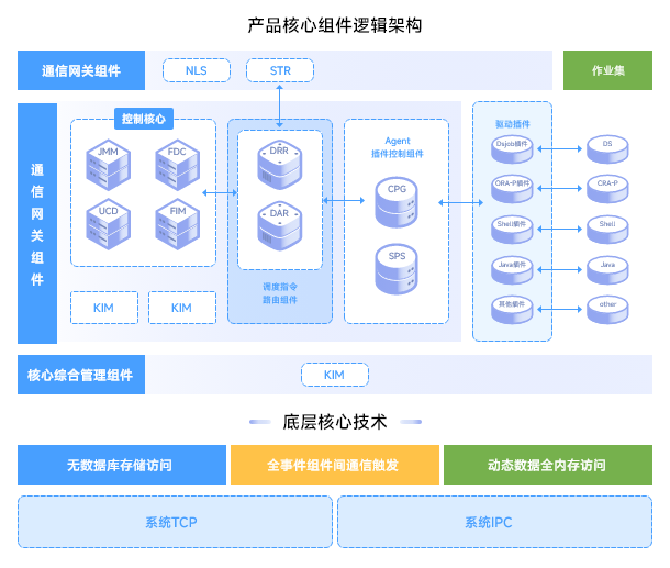 产品核心是在自主创新核心技术:无数据库存储访问、全事件组件间通信触发(消息队列)、动态数据全内存访问的基础上构建的。 在整个逻辑架构中,每一个组件对应一个系统进程,整个核心功能就是有不同功能的进程有序协同完成。