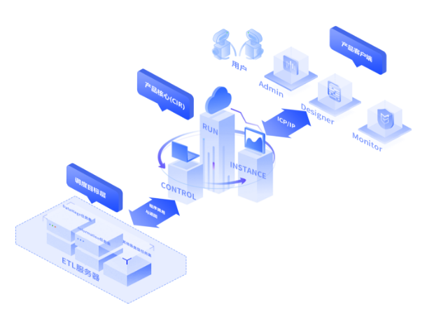 控制层是多级金字塔架构,顶层为服务控制节点,完成各种调度服务控制以及为客户端提供各种操作应用服务。而代理层完成与目标服务器(ETL 等)的控制交互。另,代理层通过主从代理级联方式,可实现对集群部署的服务器进行调度控制,实现负载均衡等。