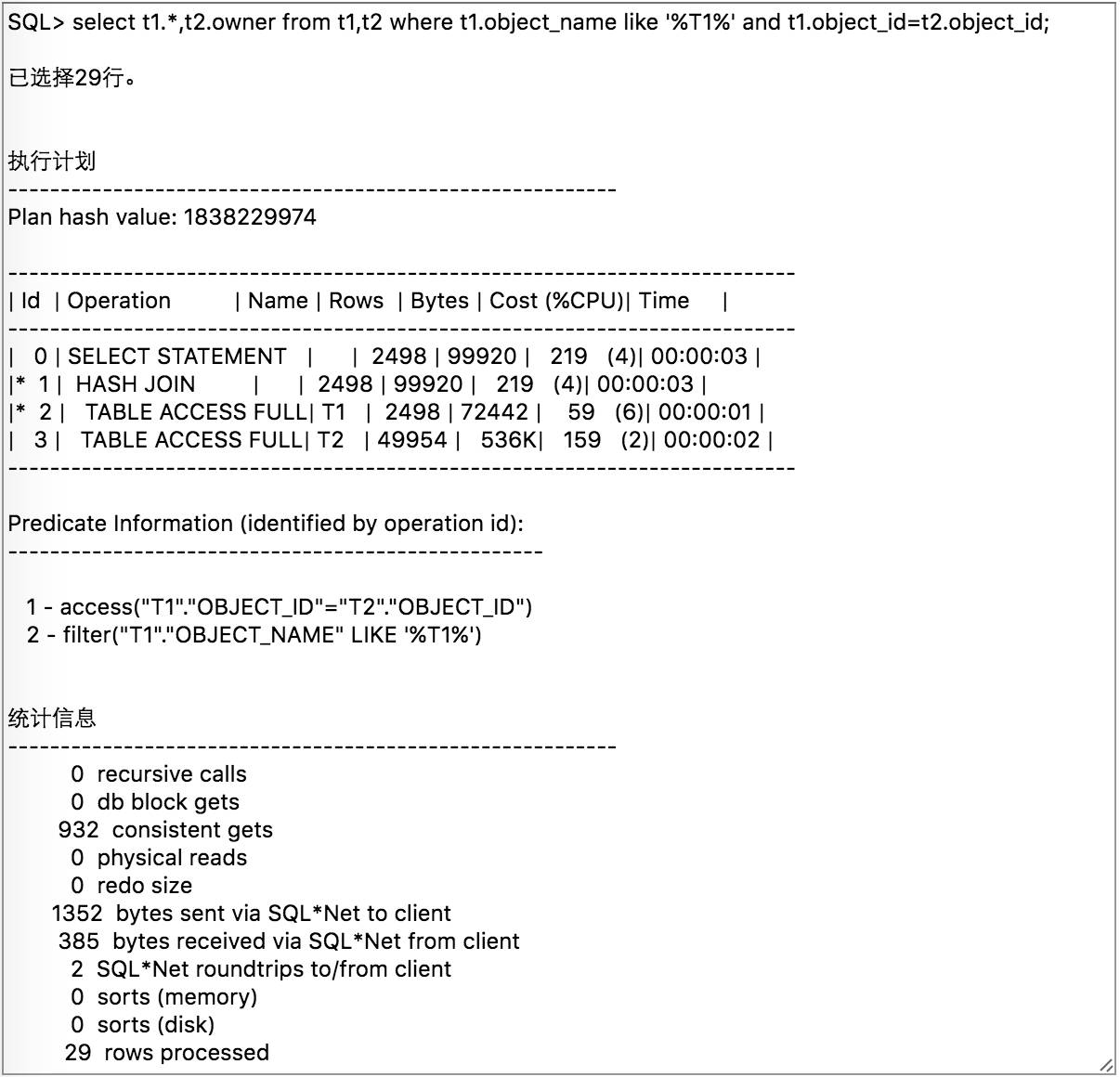 首先从执行计划可以看到,这条 SQL 语句在 2 个表上都是全表扫描。在第 1 个表 T1 上,有 like '%T1%' 这样的条件,导致只能全表扫描,这没有问题。但是第 2 个表,也是全表扫描,这里有没有问题呢?或者说是有没有优化的余地,答案显然是肯定的。