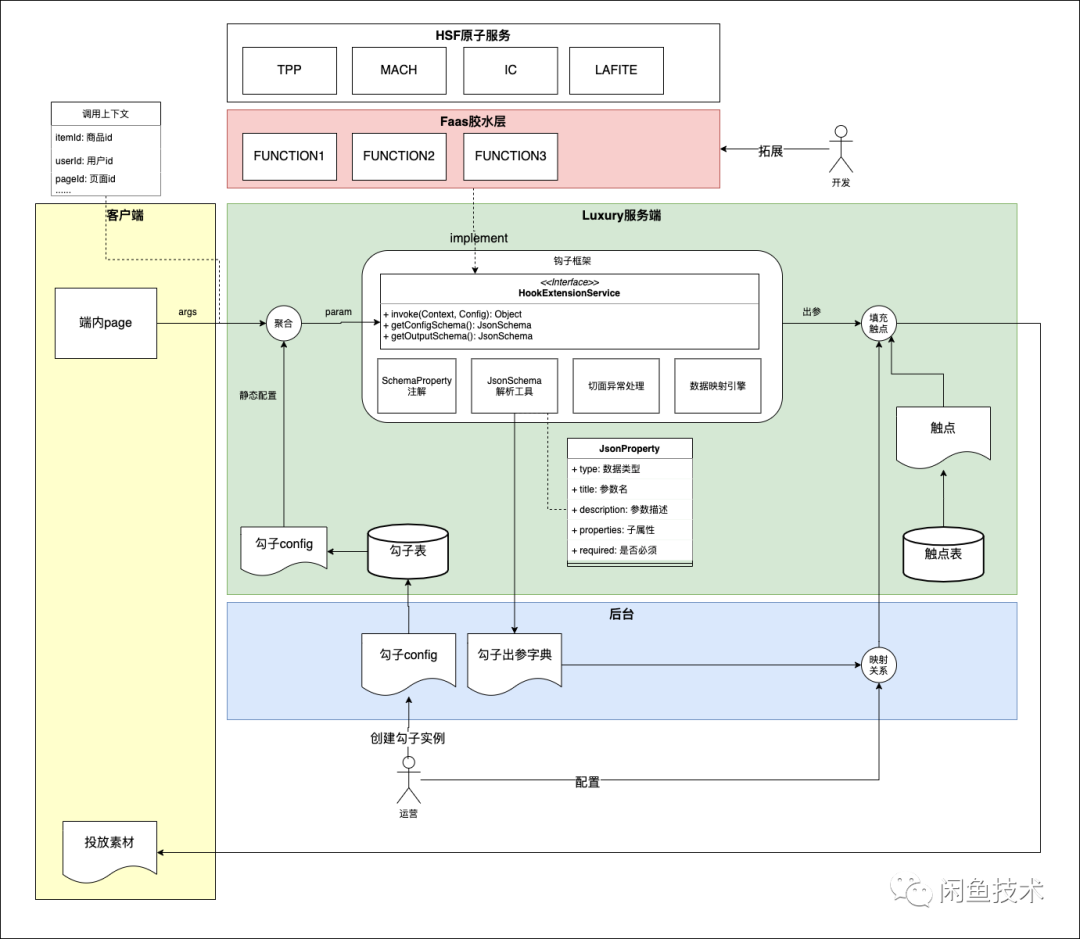 解决方案:该类问题的常规解决思路是把入参的结构信息传递到调用方,让调用方感知每次调用的入参格式。但这意味着需要拆分成两次调用,一次获取入参结构,一次发起调用。但在我们在横向分析了自己的业务场景,发现策略的入参往往是精简,有限,可枚举的,比如用户id、商品id、页面id等等。因此我们转变方案,通过每次调用时客户端传递尽可能全的上下文,而钩子从调用上下文里取需要的字段。通过冗余的参数换取更简单的设计,更少的调用次数。