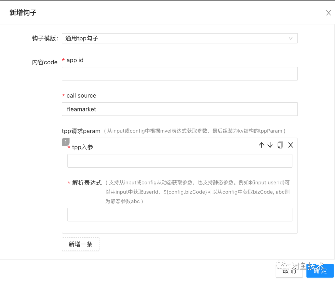 {"type": "object","properties": {"appId": {"type": "integer","title": "app id","required": true},"callSource": {"type": "string","default": "fleamarket","title": "call source","required": true},"tppParam": {"type": "array","items": {"type": "object","properties": {"key": {"type": "string","title": "tpp入参","required": true},"value": {"type": "string","default": "${input.}","description": "支持从input或config从动态获取参数","title": "解析表达式","required": true}}},"description": "从input或config中根据mvel表达式获取参数,最后组装为kv结构的tppParam","title": "tpp请求param"}}}