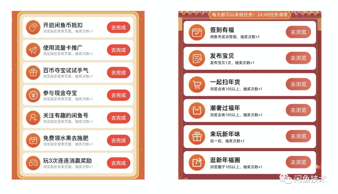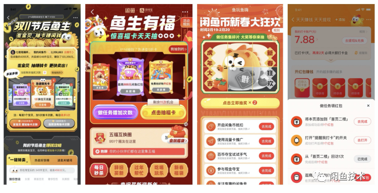 互动玩法的标准化实现在闲鱼内多个互动场景中落地,如双11的节后鱼生活动、五福主题的鱼生有福活动、闲鱼币狂欢日、天天赚钱等。