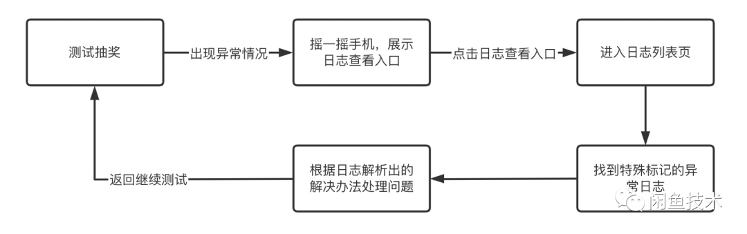抽奖SDK中有一个日志存储功能,在测试环境中将用户操作记录和服务端返回的数据存储在本地,另外提供一个日志列表页面,在页面中对日志进行解析,提供异常code的具体原因并提供解决方法,展示给运营和测试同学。自助排查功能使用流程如下图所示。