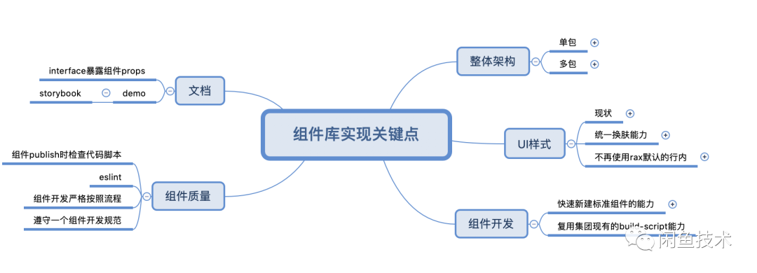 下图是我们在建设前期分析的实现上述组件库的关键技术点,后面我将围绕这个思维导图进行具体的分析