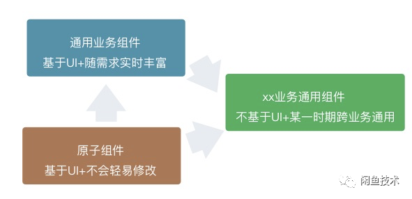 对组件进行分类最底层是原子组件,比如button,它会被通用业务组件引用,不会经常轻易修改;在这上面是通用业务组件,它是基于UI规范的产物,是随着设计需求实时丰富的;最上面是各个行业或者业务的通用业务组件,它不基于UI规范,只是某一时期各个业务线通用的交互能力。