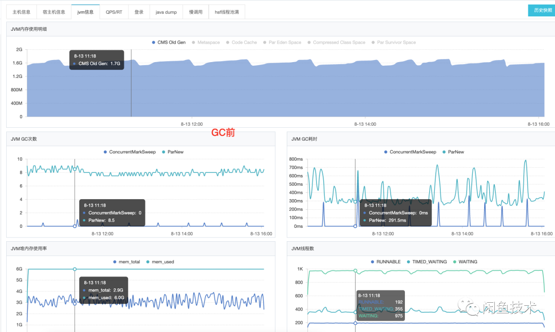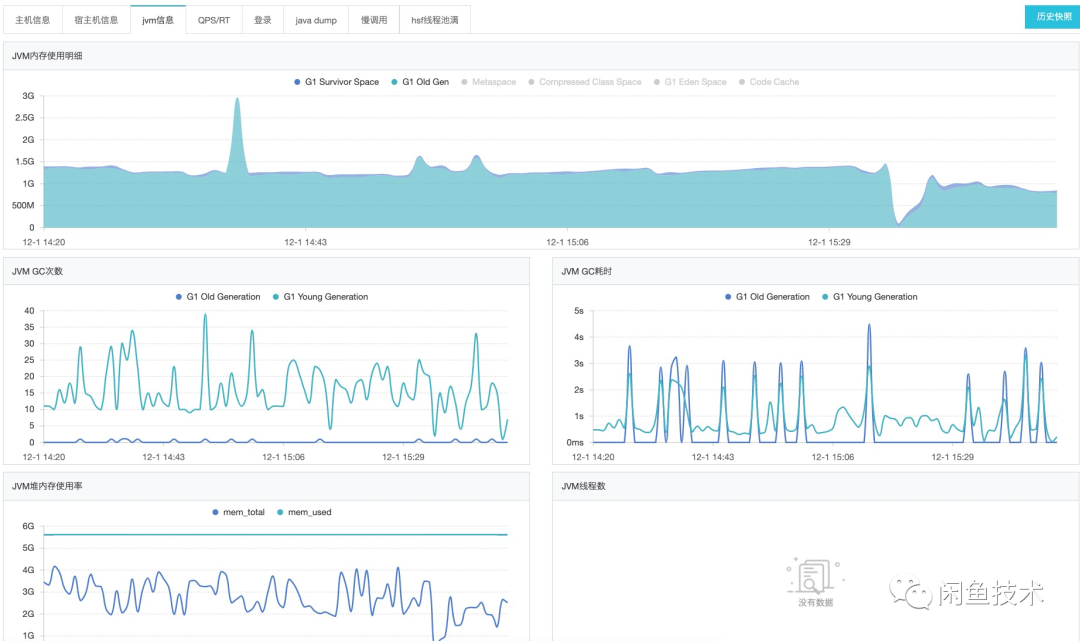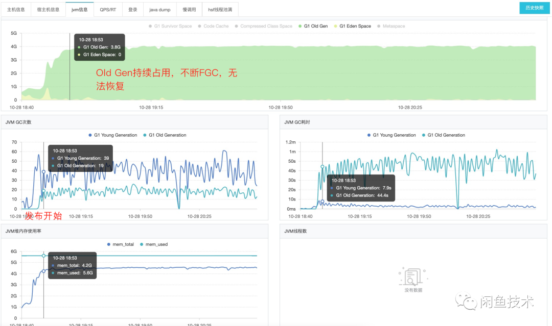 查看发生FGC机器的JVM监控,可惜监控并没能给到太多有用的信息: