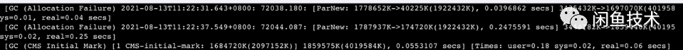 对于假设3,监控系统上以分钟为粒度聚合的折线图就不太能满足需求了,需要通过GC日志,对机器每次GC回收结束后,各个区域的堆空间占用进行分析,看是否存在一次YGC结束后,Survivor区占用较高的情况。一段非常有代表性的GC日志如下图所示: