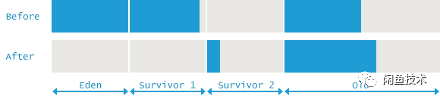 注意到ParNew是STW的算法,不存在回收过程中对象分配的可能。而一次ParNew回收前后的堆空间变化可以用下图来表示: