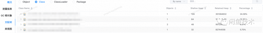 对于假设4,可以随机找一台线上机器,将流量切走后执行带FGC的Heap dump,目的是拿到FGC过后的堆对象集合。查看支配树,如下图所示: