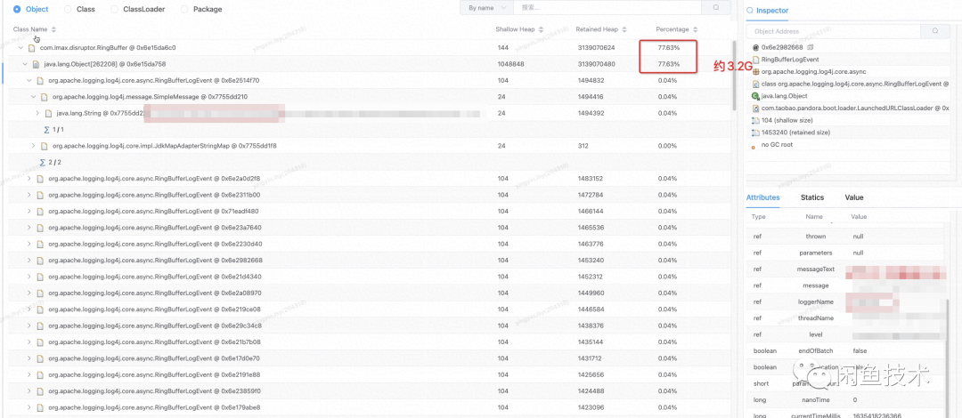 从Heap dump结果中,发现堆里面存在大量的Log4j RingBufferLogEvent,也就是说,堆里有大量的Log4j异步线程没来得及消费的日志请求。而且最大的消息体竟然能到1.4M左右的大小。