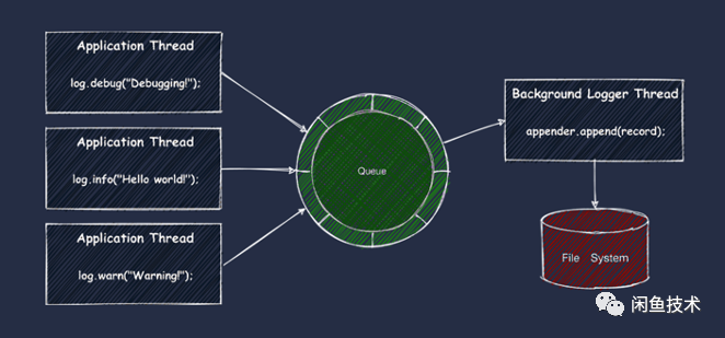 闲鱼服务端应用为了提升打日志性能,降低同步调用打日志时出现IO Hang的风险,开启了Log4j的异步日志打印功能。这也是Log4j官网比较推荐的一种性能优化方式。具体原理如下图所示:
