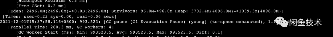 查看gc日志,发现在若干次正常的YGC后,存在一次to-space exhausted: