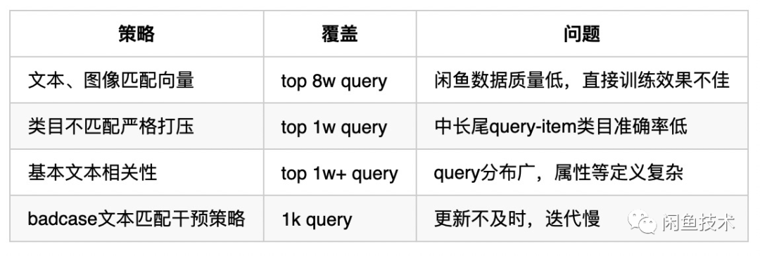 当前闲鱼搜索存在多种扩召回策略,典型的如query改写、i2i、商品图像文本抽取、同款商品文本信息扩充等。扩召回策略是必要的,但不可避免地在下游引入相关性差的case。与此同时下游的相关性控制却十分有限,在精排阶段的相关性主要存在以下问题: