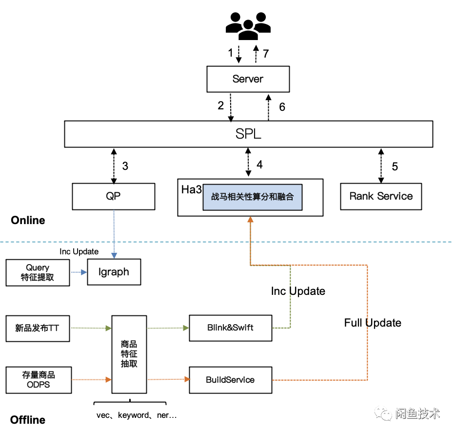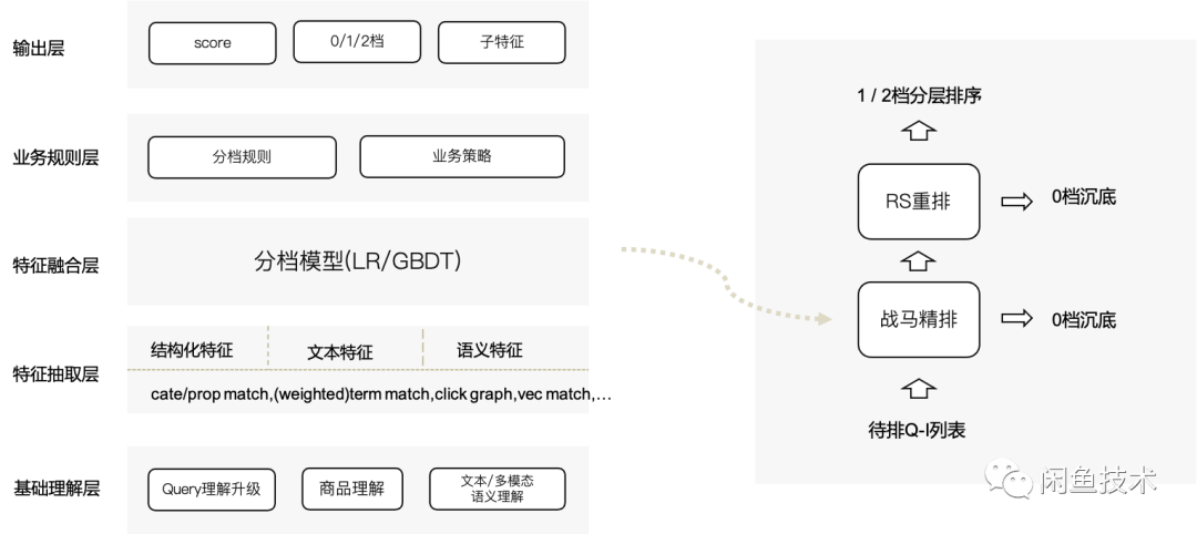 闲鱼搜索目前的工程链路为比较经典的搜索架构:SPL做数据中转和中间参数构造;QP负责query相关理解、特征抽取;检索引擎(Ha3)中做召回、粗排、精排算分、打散;RankService通过在线模型服务实现深度模型重排序。