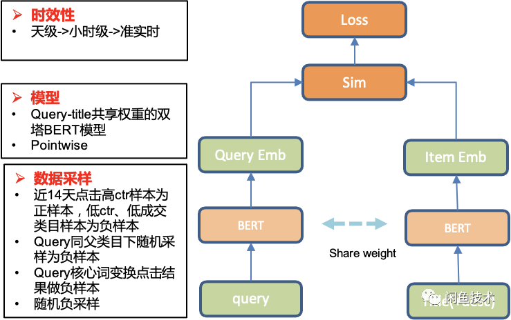 处于性能考虑,文本的语义匹配采用双塔向量匹配模型结构:基础模型使用开源的BERT,Query和Item共享相同的参数权重。同时为了适应下游的相关性分档,模型采用Pointwise的训练方式。篇幅原因,这里对模型细节不作展开。而相比模型结构的设计,其实闲鱼搜索中更重要的工作在于训练样本的构造。由于现阶段缺少人工标注数据的积累,所以当前该部分工作主要解决以下两个问题:•高置信样本挖掘,缓解搜索点击日志“点击但不相关”的问题。•定制化的负样本构造,避免模型收敛过快,只能判断简单语义相关性,而对上文提到的闲鱼场景"勉强相关"的难case无法区分。针对以上问题,参考集团相关经验并结合对闲鱼搜索数据的观察分析,做了如下采样方案: •充足曝光下高点击ctr样本(ctr大于同query下商品点击率平均值)