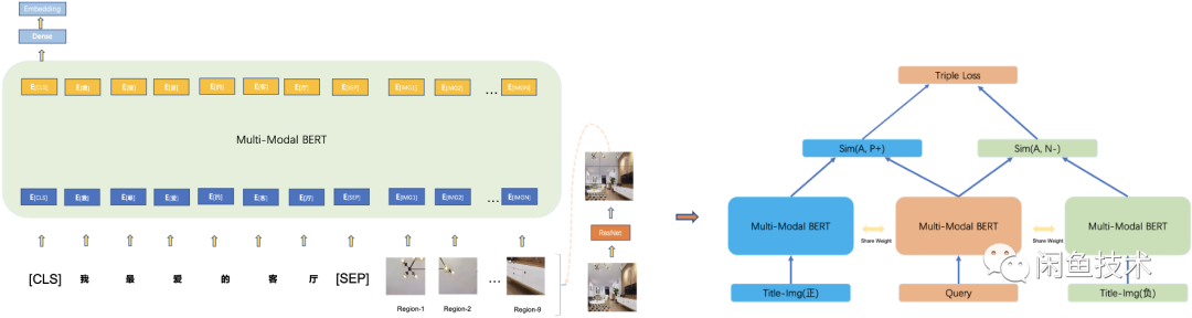除了文本语义向量匹配,本次工作也尝试了多模态语义向量。模型侧使用预训练的多模态BERT,类似工作集团已经有大量的尝试,本文主要参考过([1],[2]),并对模型和策略作了一些调整:•替换多图特征抽取为首图region特征抽取做图像特征序列(resnet pooling前的特征序列),提升链路效率;•替换Bert-base为Electra-small,减小模型参数(经测试47M的模型,下游分类任务精度损失2个点以内),方便与Resnet联合E2E训练。下游的匹配任务仍使用双塔模型策略,和文本语义模型不同的是,这里直接使用Triple Loss的方式,主要考虑加大模型之间的差异性,使后面的模型融合有更大的空间。