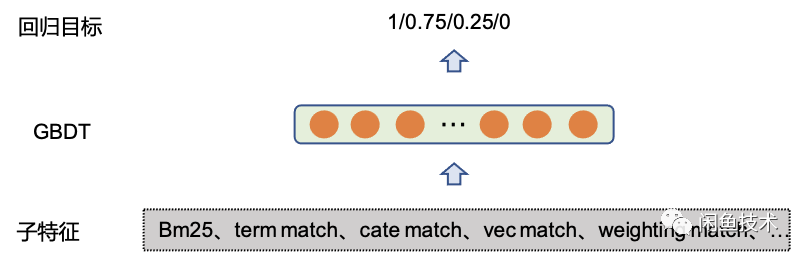 准备好必要的相关性特征后,下一步则是对众多特征的有效融合,本文则采用经典的GBDT模型完成该步骤。选择GBDT模型的好处一方面在于检索引擎(Ha3)精排算分插件中有现成的组件可以直接复用,另一方面也在于相比于更加简单的LR模型可以省去很多特征预处理步骤,使得线上策略更加简单。模型的训练使用人工标注的训练数据,标注目标为四档(完全相关、基本相关、勉强相关以及完全不相关)。在训练阶段,四个档位被映射到1、0.75、0.25和0四个分位,GBDT模型则通过回归的方式对分位进行拟合。由于该部分策略是对子特征的ensemble,因此并不需要非常多的训练数据(这里的量级在万级别)。