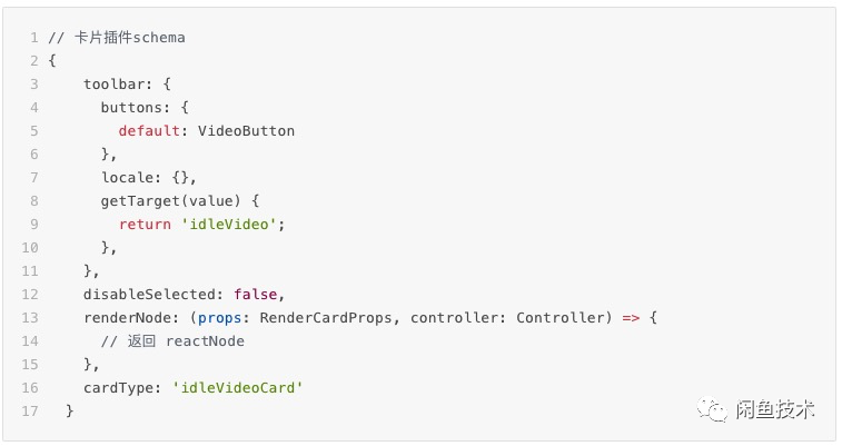 插件扩展通过定制编辑器插件来完成。我们只保留了基础的redo/undo、字体加粗、字体对齐、添加图片等编辑器自带能力,其他如视频、连接能力通过自定义插件完成。通过对we-editor插件体系封装,开发者可以像开发react组件一样开发插件。封装过程是将扩展插件都当作一种卡片,在schema里指定工具栏内容,对应点击事件,以及插入富文本的卡片样式等,即可插入任意插件。以一个插入视频的插件为例: