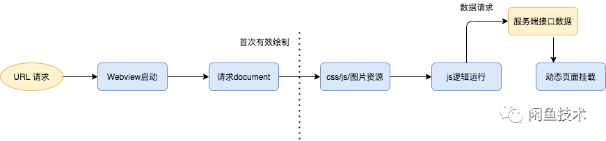 客户端loading本来是webview自带的能力,表示当前页面还有资源在加载,但其实虽然有资源在加载,但首屏的页面信息其实已经加载出来的。去掉客户端的loading,可以给用户带来更快的体感,虽然实际上并没有加快这个流过程。优化后的加载流程如下图所示: