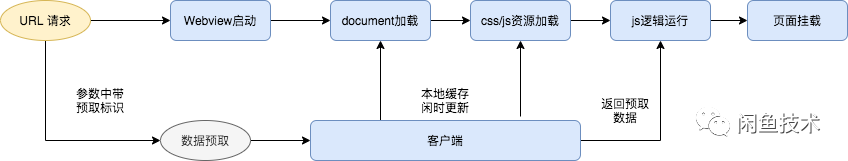 首屏渲染的时间长短有一部分取决于第一次调用的接口的返回速度,而接口请求一般要等到js逻辑触发接口请求时才发出。如果首屏需要获取的请求是一个确定的参数,那么是否可以将请求接口这个时机提前呢?我们数据预取的方案就是在用户点开页面的请求URL中就带上首屏需要请求的接口参数,然后客户端获取到这个参数后异步地请求这个数据,将结果缓存到客户端上。等到js逻辑需要发出请求的时候,判断当前请求是否已经被请求过,若请求过,则直接返回缓存在客户端上的接口数据。