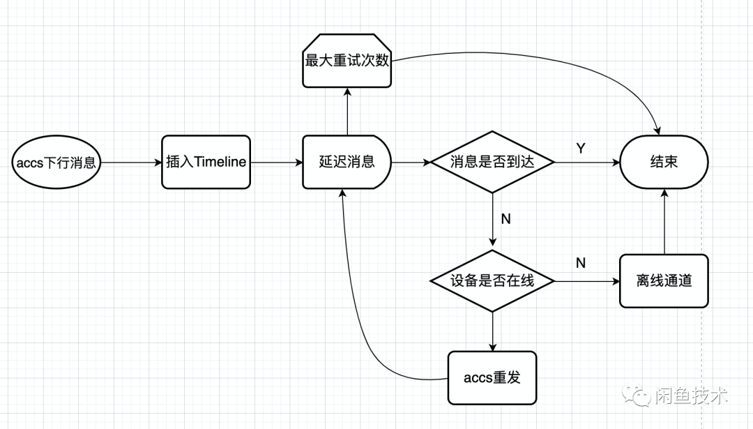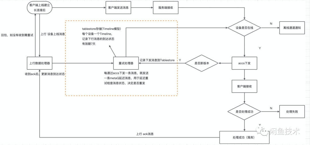 1)每通过accs下发一条消息,先插入到Timeline中,初始状态为未达,然后生产一条延迟N秒的延迟消息 2)每次消费到延迟消息后,读取tablestore中该消息的到达状态,如到达则终止延迟,否则继续 3)每次重试先判断设备是否在线,如果设备不在线,转发离线通道并终止重试,如果设备在线,则重推未到达的消息,并再次延迟N秒消费 4)每条消息的重试生命周期中用的同一条延迟消息,最多重试消费M次,超过次数不再重试并打日志埋点,后续可以监控这种情况并基于这个数据进行优化延迟重发策略