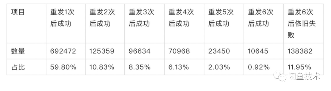 要想找到最优的延迟策略,必须从数据中通过分析得到答案,天马行空的想象往往离实际相差甚远,我们先采用固定的延迟时间(10s)最大重试6次来分析一波数据我们通过这组数据可以看到,有约85%的消息在40s内重发可以投递成功,还有12%的消息在达到最大重试次数后依旧没有收到ack,在4次重试之后,第5次成功只有2.03%,第6次只有0.92%,继续重发的收益已经变得很低,6次以后还有部分消息没有收到ack,这部分消息如果用固定延迟时间策略,性价比很低,频繁重发浪费系统资源,我们继续改进策略。固定延迟+固定步长递增