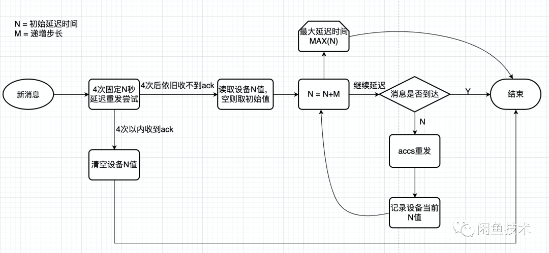 考虑到部分用户的网络短时间无法恢复,频繁的短间隔重发价值不大,我们采用4次固定短间隔延迟N秒后,之后每次延迟时间都是上一次延迟时间递增固定步长M秒的策略,直到收到ack、用户设备离线或者达到了最大延迟时间MAX(N)。这种策略一定程度上可以解决固定延迟时间重发策略的问题,但如果用户短时间网络无法恢复,每次重发都要重新递增,也不是一种最优解。自适应延迟