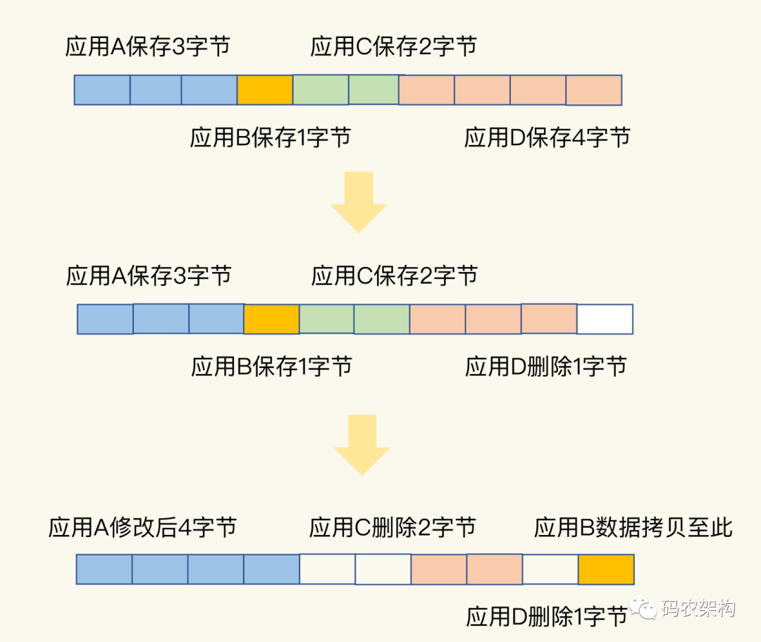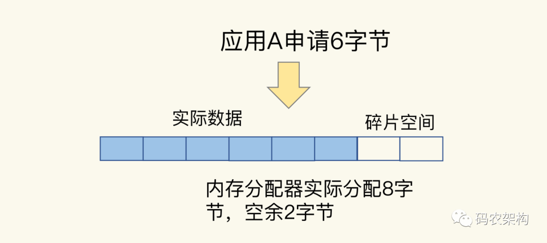 比如说,应用 A 保存 6 字节数据,jemalloc 按分配策略分配 8 字节。如果应用 A 不再保存新数据,那么,这里多出来的 2 字节空间就是内存碎片了,如下图所示: