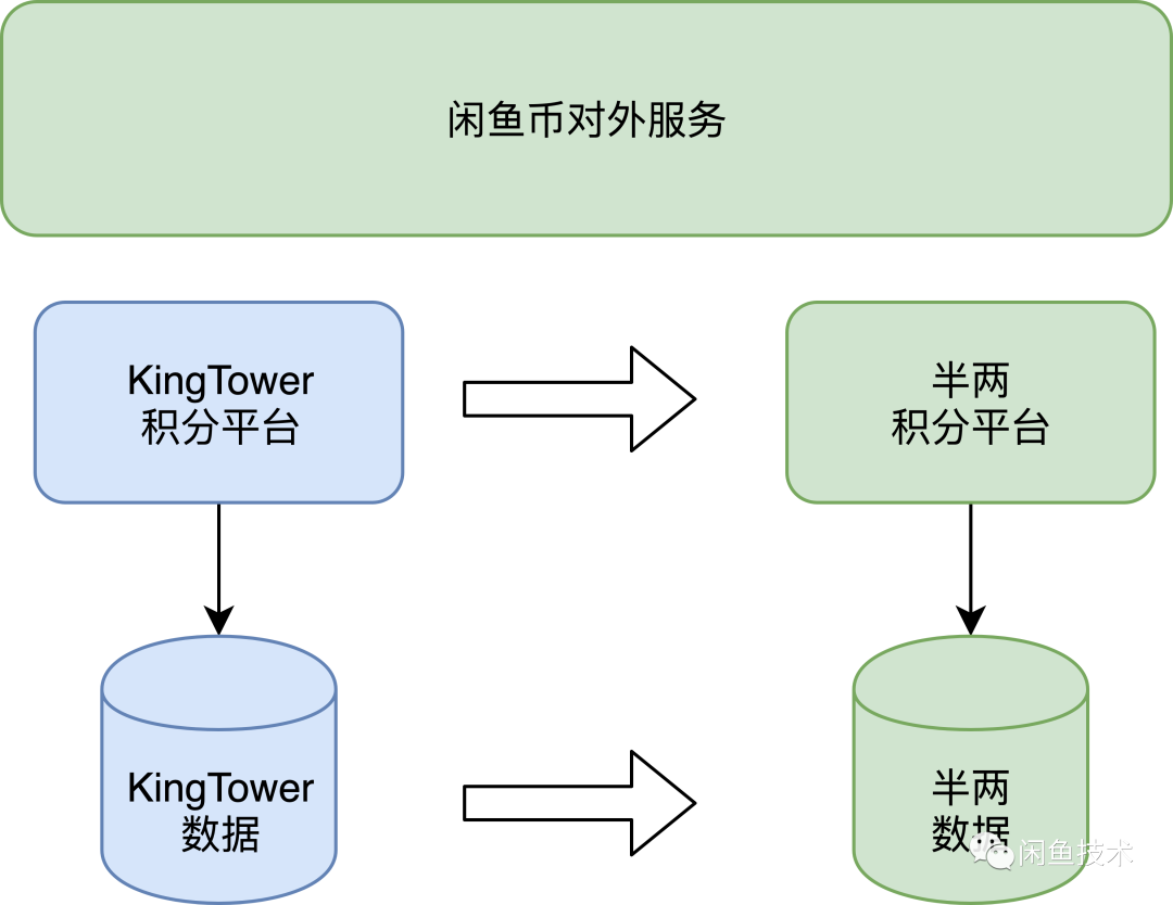一般数据迁移是通过数据库相关工具进行操作,具体可以参考《21世纪了还愚公移山?数据库这么迁移更快!》。但闲鱼币数据迁移却不同,首先“KingTower”平台的数据结构和“半两”平台的数据结构不同;其次出于对数据安全和稳定性的考虑,两个积分平台只对外提供服务接口,不允许业务方直接操作平台数据库。这就意味着闲鱼币迁移无法利用数据库工具,只能通过两个平台提供的服务接口完成迁移工作。本文将结合闲鱼币迁移过程,提供一种基于服务接口的数据迁移方案,在用户无感知的情况下完成迁移目标。
