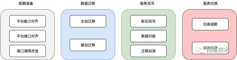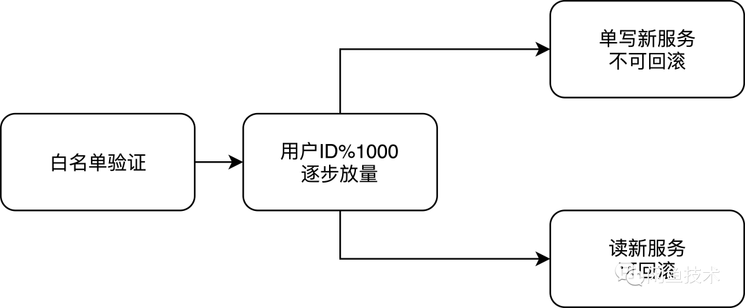 切换过程采用逐步放量的形式,灰度方式很多我们采用的是先白名单验证,然后用户ID取模1000逐步放量的方式。值得注意的一点是读灰度和灰度要分开进行,当对账没有问题的时候就可以开启读灰度了,在读灰度过程中仍旧保持双写,此时如果读灰度发现问题,仍旧可以回滚会老的服务。但是单写新服务开始后就无法进行回滚,所以在写灰度前需要充分白名单验证。无需关心底层数据存储,只需做好上层业务逻辑兼容即可。