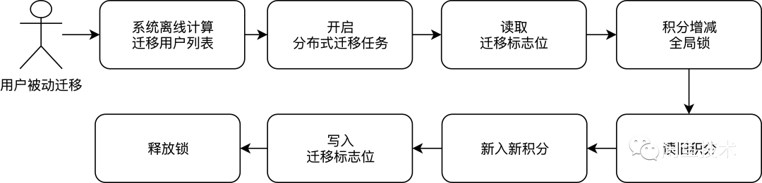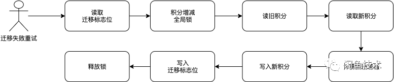 主动迁移和被动迁移最终目的都是把用户数据从老积分账户数据迁移到新积分上,两种方式各有自己的应用场景,主动迁移主要适用于迁移活跃用户和新增用户,被动迁移主要适用于迁移存量用户。两种迁移遇到的技术难点是一样的。第一并发处理,在上面两种方案只展示了迁移过程中要获取全局分布式锁,对于未迁移的用户在进行加减操作时候同样也要获取全局锁,具体如下图所示,这样才能保证迁移过程中不产生脏数据,本文中的全局锁使用的是Redis实现,这里不再赘述。