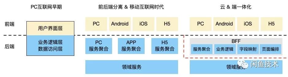 PC互联网早期没有还没有前后端的概念,此阶段单个业务需求通常一个开发人员可以完成研发,前端网页与后端逻辑都写在一个工程中。随着业务越来越复杂,原本开发者负责前后端研发已经变得效率低下,此阶段随着移动互联网的爆发,服务端需要服务与PC、Android、iOS等多种前端。