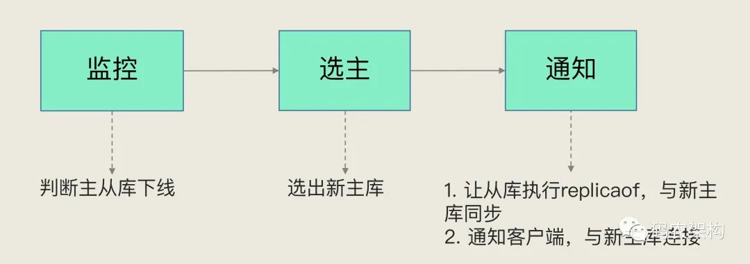然后,哨兵会执行最后一个任务:通知。在执行通知任务时,哨兵会把新主库的连接信息发给其他从库,让它们执行 replicaof 命令,和新主库建立连接,并进行数据复制。同时,哨兵会把新主库的连接信息通知给客户端,让它们把请求操作发到新主库上。