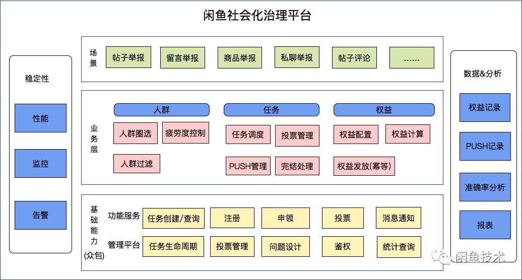 2. 任务服务(参考图中基础能力中的功能服务),用于提供给上游调用的服务接口,主要有任务创建、查询、注册、申领、投票、消息通知(如完结、超时消息)服务能力。3. 任务调度(参考图中业务层的任务模块),我们需要将各种任务按照一定的时间周期投放到相应的人群中,考虑到任务的量级比较大,采用了阿里云的分布式任务调度系统SchedulerX,利用集群的能力快速的将任务投递出去。人群用于管理什么样的人有资格去领任务,从上图中的人群模块可以看出,主要包括人群圈选、疲劳度控制、人群过滤。人群圈选,也是人群服务的核心能力,一方面提供基于集团奥格服务提供人群画像及各种维度的指标圈选能力,运营可以根据不同场景圈选不同人群,并通过人群分桶分析效果。另一方面人群圈选完成后,在实际的运行过程中发现还是有部分的人群并不是很愿意处理任务,因此人群并不能只进不出,需要根据任务处理结果引导人群的正向优化闭环,持续迭代。疲劳度控制,人群圈选完后,我们还需要控制人群处理上限,防止过度处理,疲劳度控制主要用于解决此类问题。人群过滤,在任务分发处理时,需要考虑特殊人群要直接过滤,如原始任务的作者等。
