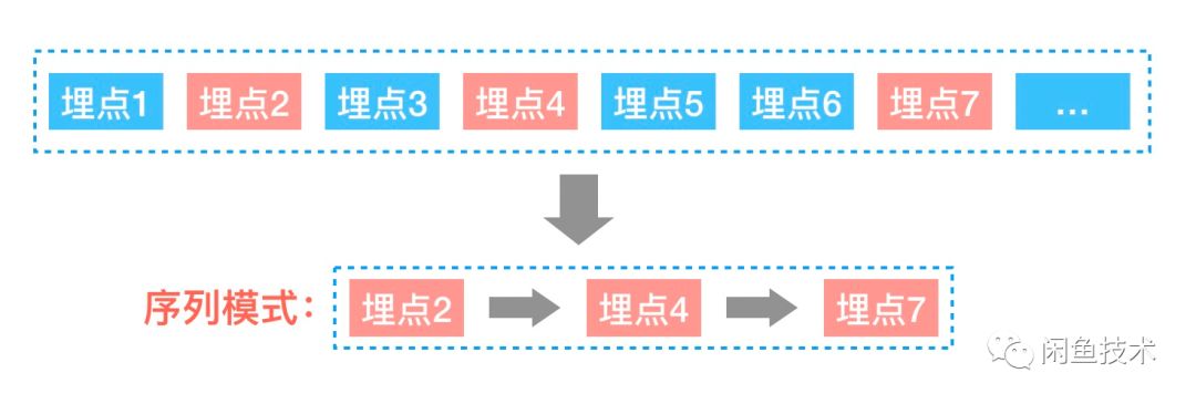 以我们埋点数据为例,用户产生的埋点数据,根据时间排列可以得到一串埋点序列(上图中埋点1到埋点7), 而序列模式挖掘的作用,就是可以从大量用户的埋点序列中,找到其中隐藏着的模式: